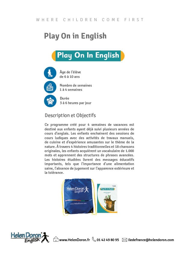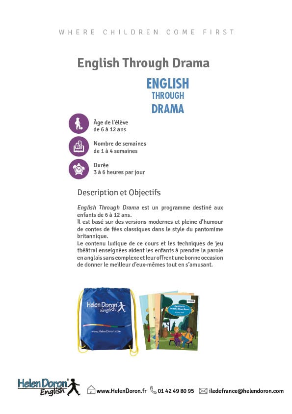 English Through Drama est un programme destiné aux enfants de 6 à 10 ans. Il est basé sur des versions modernes et pleine d’humour de contes de fées classiques dans le style de la pantomime britannique. Le contenu ludique de ce cours et les techniques de jeu théâtral enseignées aident les enfants à prendre la parole en anglais sans complexe et leur offrent une bonne occasion de donner le meilleur d’eux-mêmes tout en s’amusant.