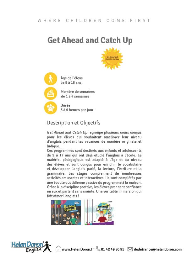Get Ahead and Catch Up est un programme destiné aux enfants et adolescents qui ont déjà étudié l’anglais à l’école. Le matériel pédagogique est adapté à l’âge et au niveau des élèves et sont conçus pour enrichir le vocabulaire et développer l’anglais parlé, la lecture, l’écriture et la grammaire.