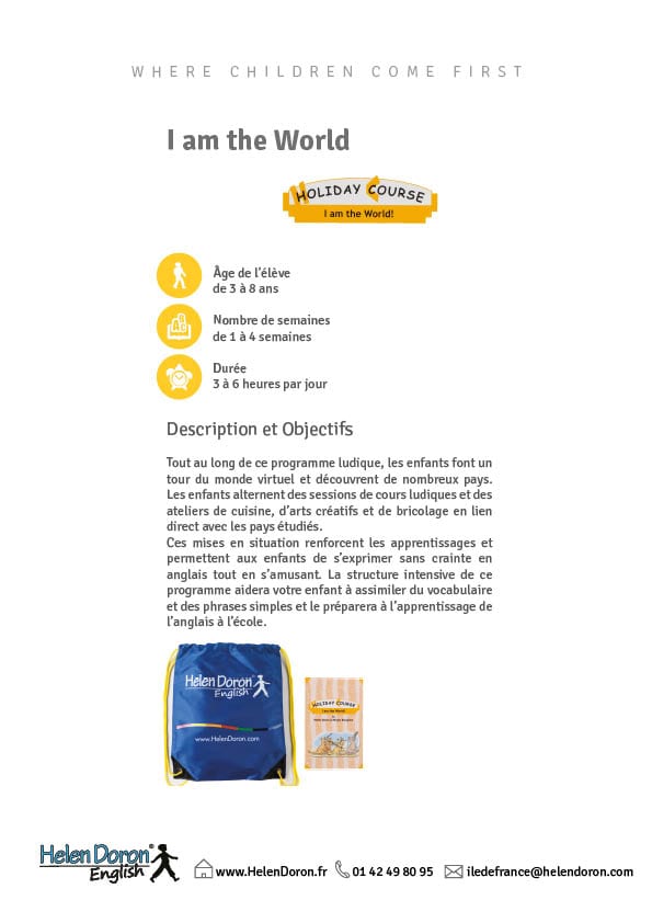 Tout au long de ce programme ludique, les enfants font un tour du monde virtuel et découvrent de nombreux pays. Les enfants alternent des sessions de cours ludiques et des ateliers de cuisine, d’arts créatifs et de bricolage en lien direct avec les pays étudiés. Ces mises en situation renforcent les apprentissages et permettent aux enfants de s’exprimer sans crainte en anglais tout en s’amusant. La structure intensive de ce programme aidera votre enfant à assimiler du vocabulaire et des phrases simples et le préparera à l’apprentissage de l’anglais à l’école.